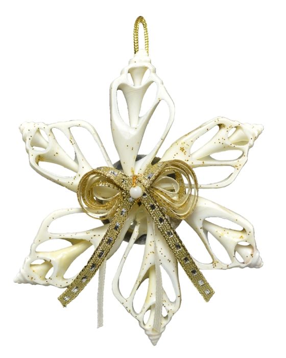 Spend your Christmas at the beach! This natural shell ornament is made from the centers of strombus canarium shells arranged in circle to create a snowflake-like pattern affixed to a capiz shell disk. With a beautiful and stylish gold bow in the center and a light dusting of gold glitter, this shell ornament will fit right in with your regular Christmas ornaments. Or combine with our other shell ornaments for your own Christmas in July!