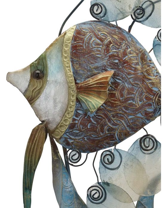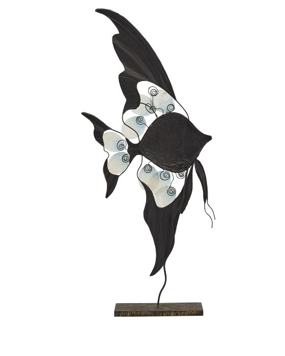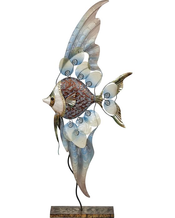 Absolutely elegant is all there is to be said about this metal and natural capiz shell banner fish sculpture. Standing at a regal 28" tall, this bronze metal fish with capiz shell scales will grace any home or office. In a foyer, living room, bedroom, powder room, den or even kitchen, this artwork will be the center of attention. A seller favorite!!!
