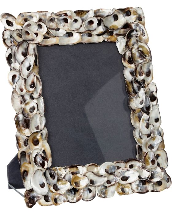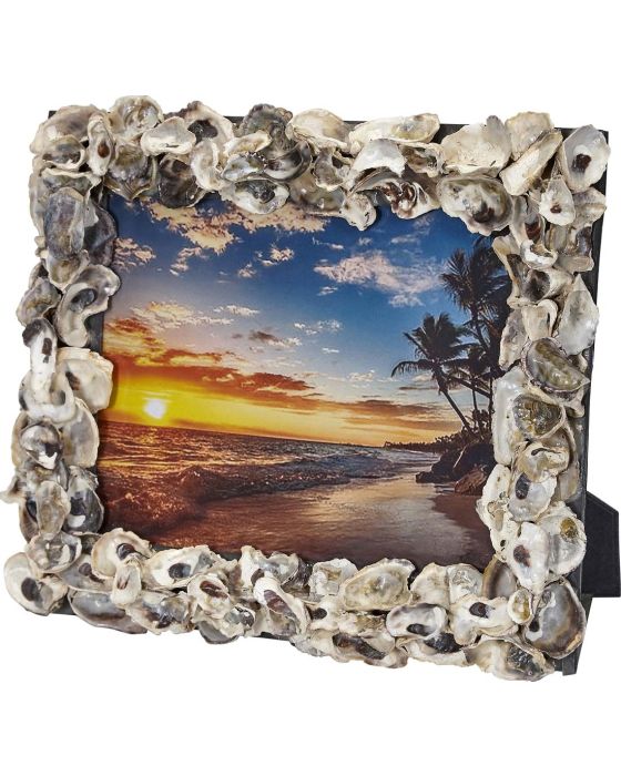 What a great way to remember an oceanside vacation! The great times and meals and walks on the beach will be even more noticeable in your home or office when you display your favorite photos in a natural oyster shell frame. This 8" x 10" (actual frame size 12" x 14") looks great with it's 4" x 6" counterpart, too! Contains glass.