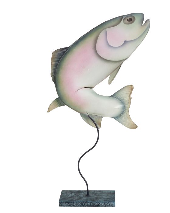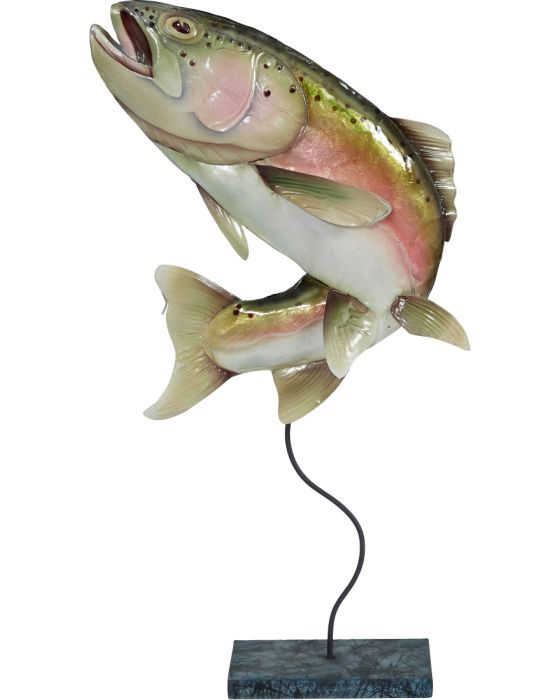 Add a touch of whimsy to your home with our Capiz & Metal Rainbow Trout on Stand. This unique piece of coastal decor features a colorful rainbow trout made from capiz and metal, perched on a stand for easy display. The beige and green hues of the trout add a pop of color to any room, making it the perfect addition to your nautical themed decor. Measuring 17x9x4", this piece is the perfect size to fit on a shelf, mantel, or side table. Bring the beauty of the ocean into your home with The Seashell Company's Capiz & Metal Rainbow Trout on Stand.