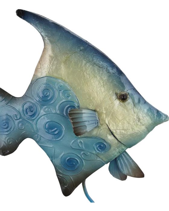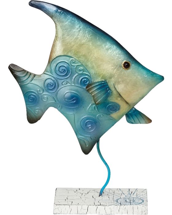 In blue, green and cream shades from the sea, this shy Banner Fish table decor is beautiful and serene. The glistening sheen comes from inlaid natural Capiz shell throughout the body, mounted on metal, and the wood stand has a rustic nautical finish. Great in home or office!
