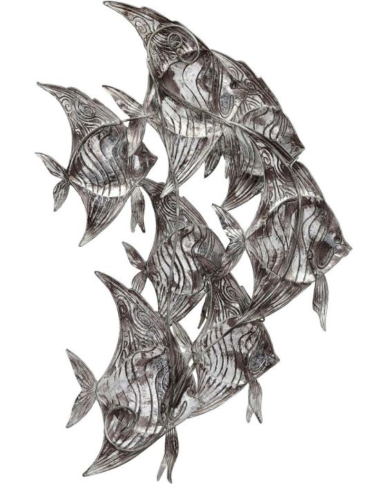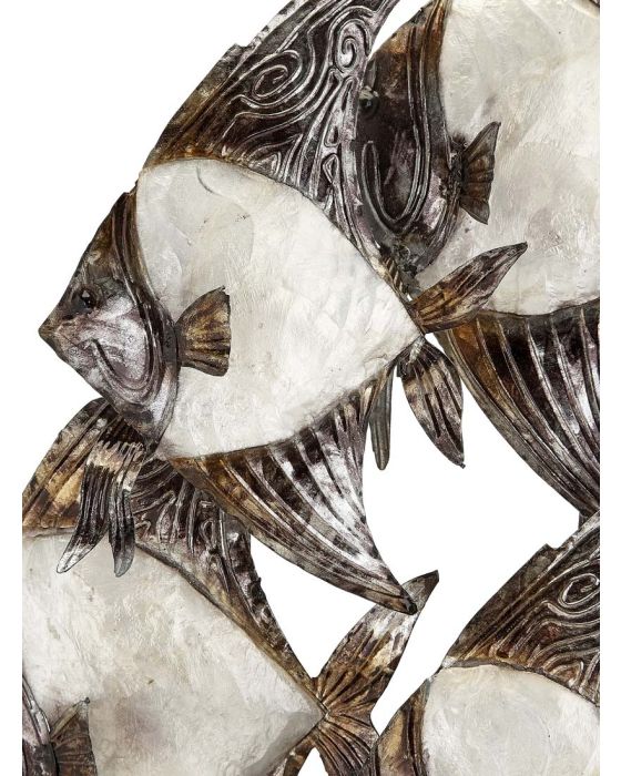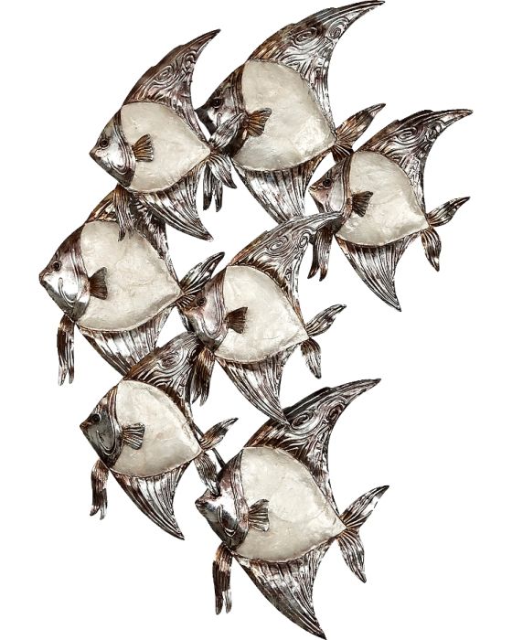This school of Capiz Banner Fish will delight all ages, as seven (7) fish swimming in formation are headed... somewhere! Steel and bronze-toned metal surround the ivory bodies and black eyes of the Capiz inlaid fish. At a sizeable 24" x 15", this wall decor will add depth to any office or home -- great for rooms, hallways, patios or balconies!!